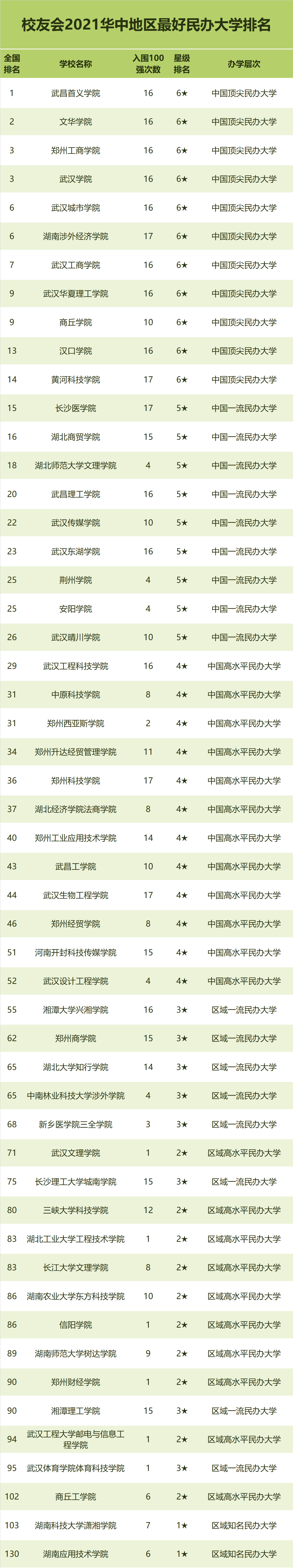 在最新2021中国最好民办大学排名中,武昌首义学院、珠海科技学院、西安欧亚学院分列2021中国最好民办大学排名第一。武昌首义学院、文华学院、郑州工商学院、武汉学院、湖南涉外经济学院、武汉城市学院位列2021校友会华中地区最好民办大学排名前五强。