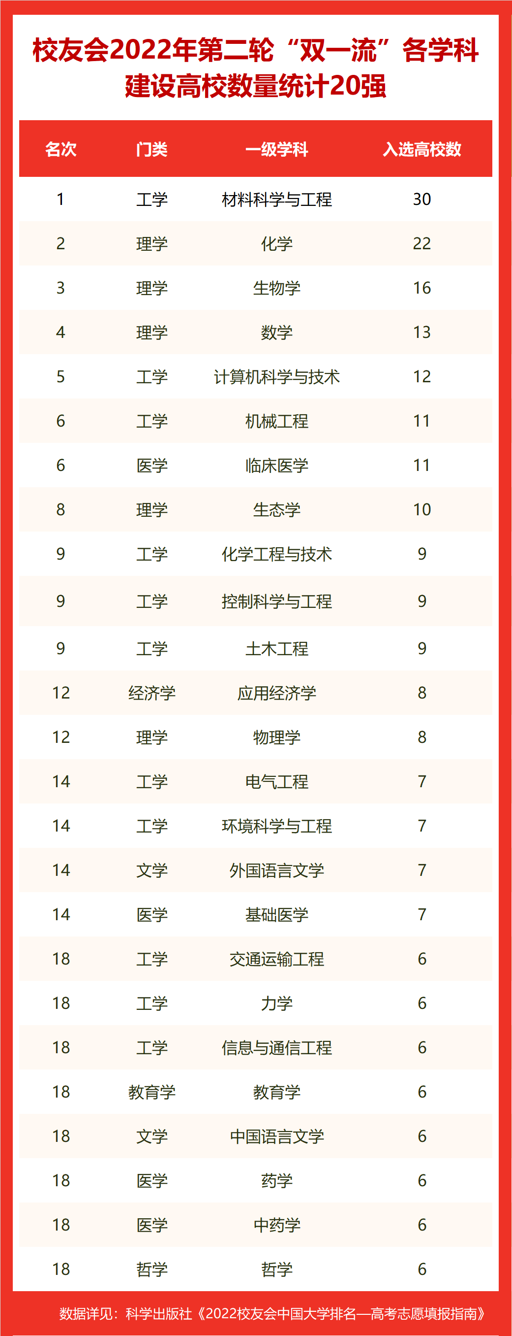 统计显示,在第二轮“双一流”建设学科中,除北京大学、清华大学外全国共有433个一级学科上榜。第二轮“双一流”建设学科扎堆工学、理学、医学、农学和法学等门类,建设学科完全按照国家颁布的学科目录进行认定,不再参考各类世界大学学科排名的学科分类标准。其中,材料科学与工程、化学、生物学、数学和计算机科学与技术等学科入选高校数量最多,成第二轮“双一流”建设的最大赢家。