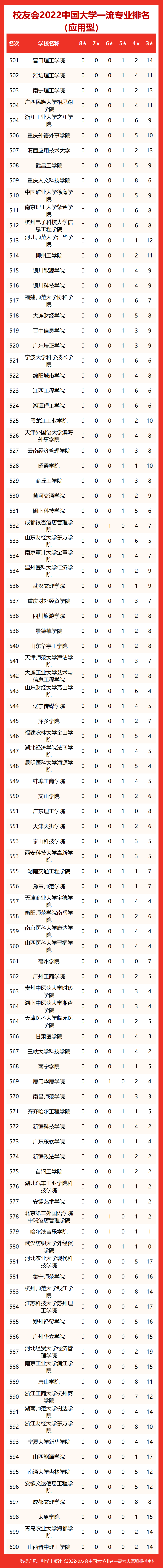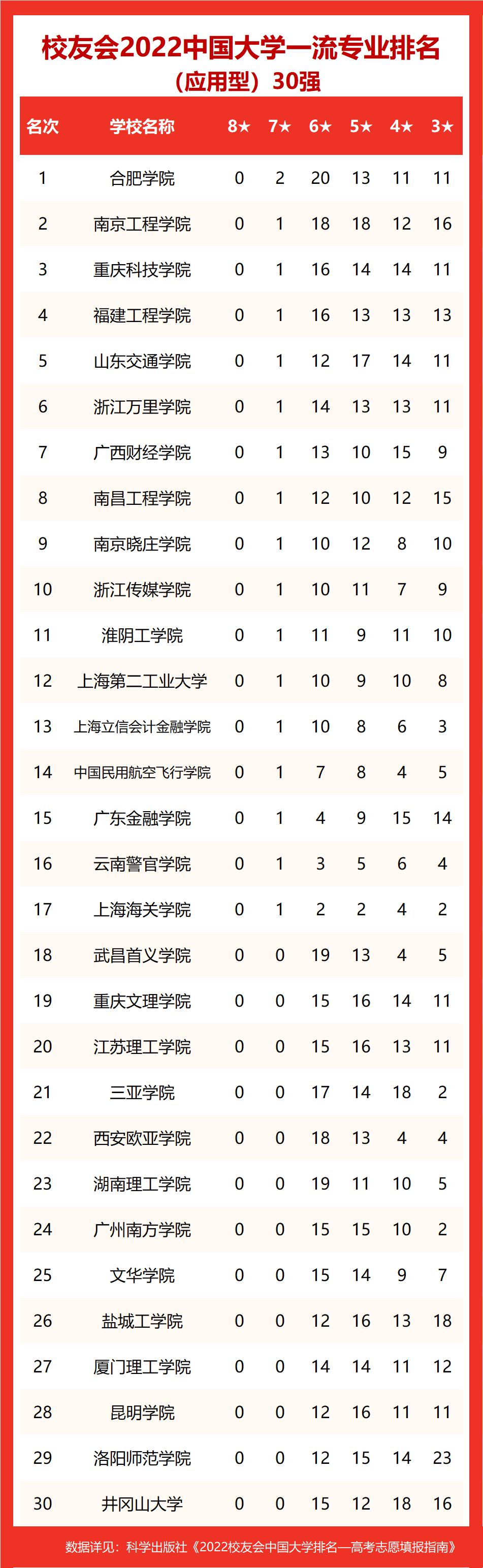 在最新校友会2022中国大学一流专业排名(应用型)中,合肥学院有2个中国七星级专业(7),20个中国六星级专业(6),13个中国五星级专业(5),雄居校友会2022中国大学一流专业排名(应用型)榜首,是2022年中国应用型本科专业建设水平最高、办学特色最为鲜明的应用型大学。南京工程学院第2,有1个中国七星级专业(7),18个中国六星级专业(6),18个中国五星级专业(5)。重庆科技学院第3,有1个中国七星级专业(7),16个中国六星级专业(6),14个中国五星级专业(5)。