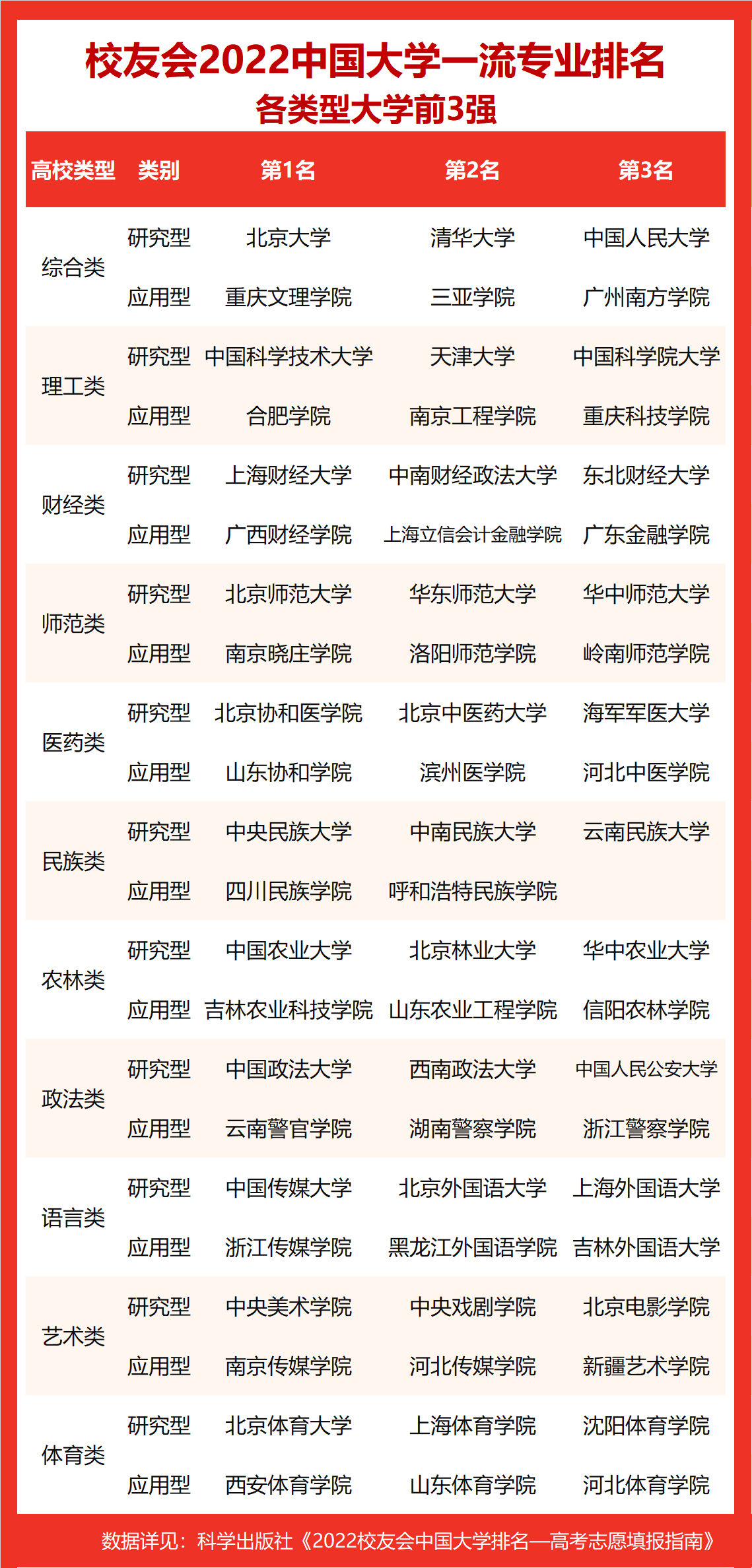 在最新校友会2022中国各类型大学一流专业排名(研究型)中,北京大学雄居综合类大学排名首位,中国科学技术大学位列理工类大学冠军,北京师范大学名列师范类大学第一,上海财经大学位居财经类大学榜首,中国农业大学高居农林类大学第一,北京协和医学院位列医药类大学第一,北京体育大学名列体育类大学第一,中国传媒大学位列语言类大学第一,中国政法大学位列政法类大学榜首,中央美术学院位居艺术类大学第一,中央民族大学位列民族类大学第一。