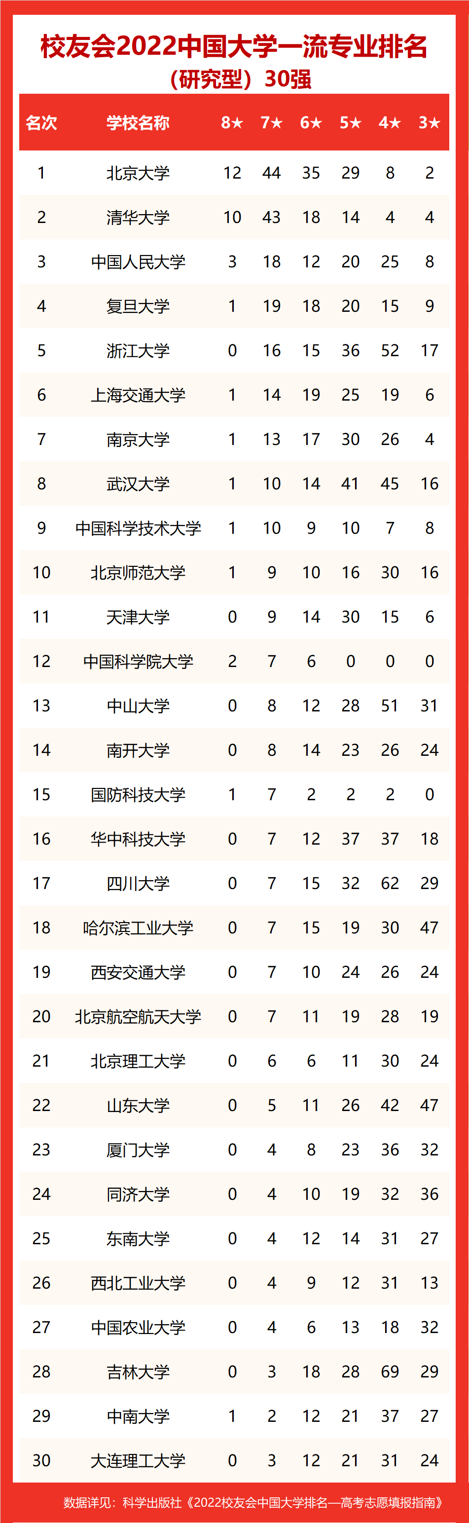 榜单显示,在最新校友会2022中国大学一流专业排名(研究型)中,北京大学拥有12个中国八星级专业(8),44个中国七星级专业(7),35个中国六星级专业(6),29个中国五星级专业(5),雄居校友会2022中国大学一流专业排名(研究型)首位;清华大学列第2,有10个中国八星级专业(8),有43个中国七星级专业(7),18个中国六星级专业(6),14个中国五星级专业(5)。北京大学、清华大学是2022年中国大学本科专业实力最强、专业建设水平最高、办学特色最为鲜明的世界一流大学。
