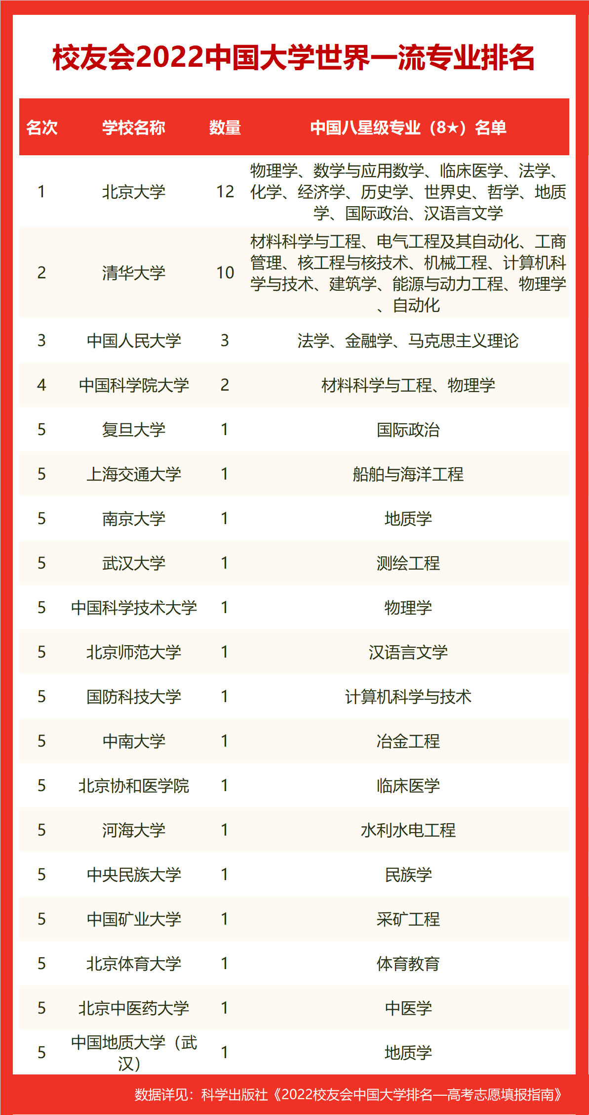 中国八星级专业(8)是世界一流专业、中国最顶尖专业,代表中国本科专业教育的最高水平。在最新校友会2022世界一流专业排名中,全国共有42个专业荣膺中国八星级专业(8),跻身世界一流专业、中国最顶尖专业行列。其中,北京大学12个专业荣膺中国八星级专业(8),位居全国高校首位,清华大学10个,位居第2,;中国人民大学3个,名列第3;中国科学院大学2个,位居第4;复旦大学、上海交通大学、南京大学和武汉大学等各1个,并列第5。
