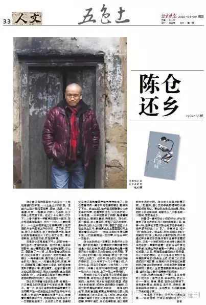 4、袁敏(著名作家、出版人,时任《江南》杂志主编)撰文《陈仓进城,为何惦记还乡》,在4月9日《北京晚报》用3个版予以刊发。