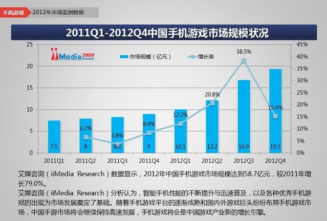 2013年3月13日消息,全球领先的移动互联网第三方数据挖掘和整合营销机构艾媒咨询(iiMediaResearch)今日发布的《2012中国手机游戏市场年度报告》。报告显示,2012年中国手机游戏市场规模达到58.7亿元,较2011年增长79.0%。其中,2012年中国手机网络游戏市场规模达到21.77亿元。