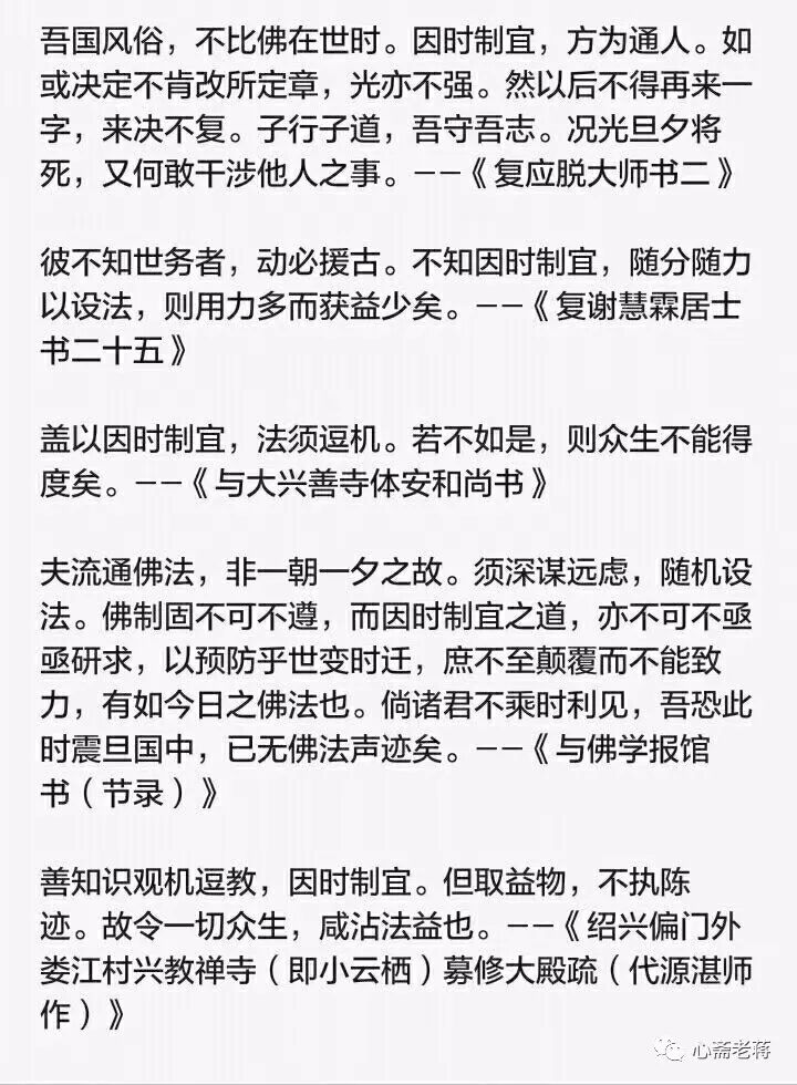盖以因时制宜,法须逗机。若不如是,则众生不能得度矣。——《与大兴善寺体安和尚书》