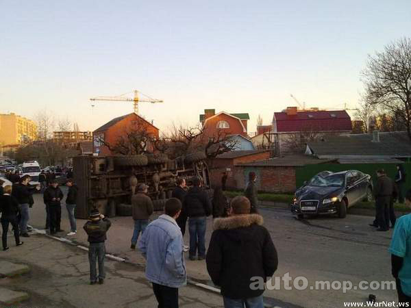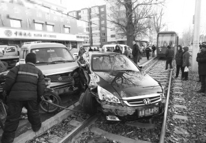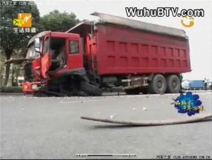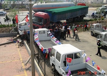 大货车和奇瑞A3:(大货车为了躲避前方左转弯方向来的车辆,逆行占用车道,撞到正常行驶的奇瑞A3,由于大货车满载,惯性太大,撞到A3后,顶着A3又撞到路边摆放的新货车1。新货车1又把电线杆1、公司围墙、和新货车2撞到。新货车2溜车又把电线杆2和电线杆3撞倒,奇瑞A3被夹在中间。可见当时重卡车的威力。)