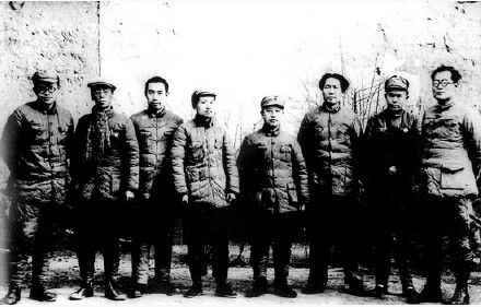 左起张闻天、康生、周恩来、凯丰、王明、毛主席、任弼时、张国焘