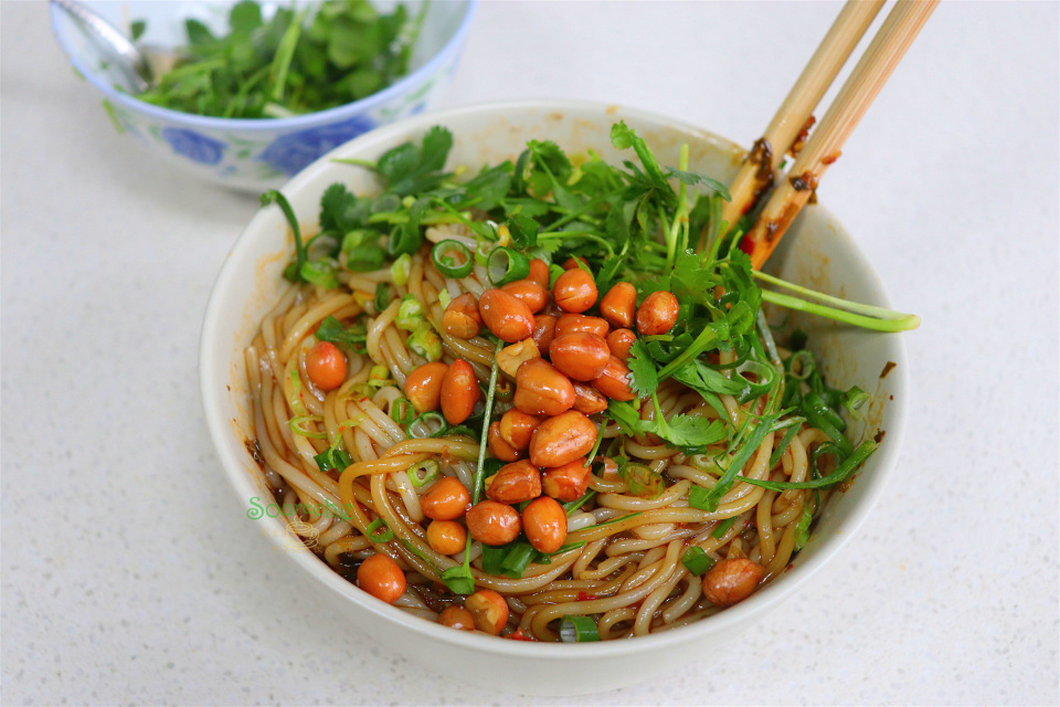 步骤5:再添加2小勺沸水搅拌均匀,最后放入香葱、香菜、花生,搅拌均匀。一道美味的南昌拌粉就烹饪完成,Q弹爽滑,酸辣适中,酱香浓郁,很好吃。