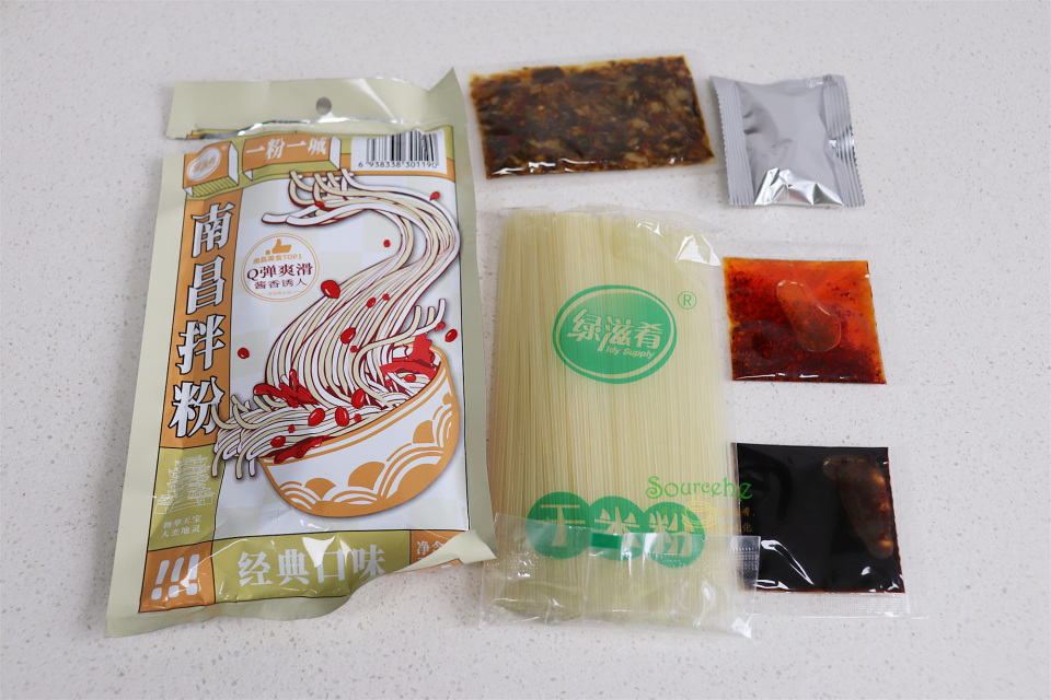 步骤1: 南昌拌粉,采用是江西大米制作,粗细适中,不同广东的米粉,南昌拌粉比广东米粉细,又比广东的粉丝要粗,做拌粉很适合。配料都有独立包装,根据自己口味,增减加入拌面。