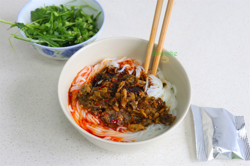 【sourcehe温馨小贴士】1.煮米粉,很容易有气泡冒出锅面,这个时候需要加少许冷水,快速降温,就不会溢出。2.煮好的米粉,很多黏稠物,需要过水,把黏稠冲洗掉,拌粉才好吃。天气冷的拌粉就用沸水,天气热,可以把水烧开之后,放凉。3.配料的味道很足,只需要加少许香葱、香菜,拌面就很好吃。