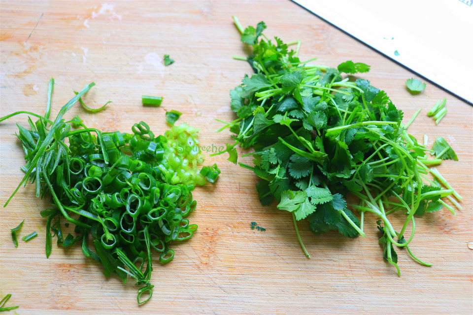 步骤2:香葱、香菜,分别清洗干净,沥干水备好。阳台种葱,很方便,吃面条放一点,不需要购买,重要的是种植一盘,一年四季都有吃。