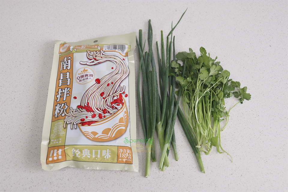 【南昌拌米粉】(以下是一人份)食材: 南昌拌粉1包(米粉120克、调料69克)香葱、香菜,适量,我是阳台上自己种植的,剪几根就可以。