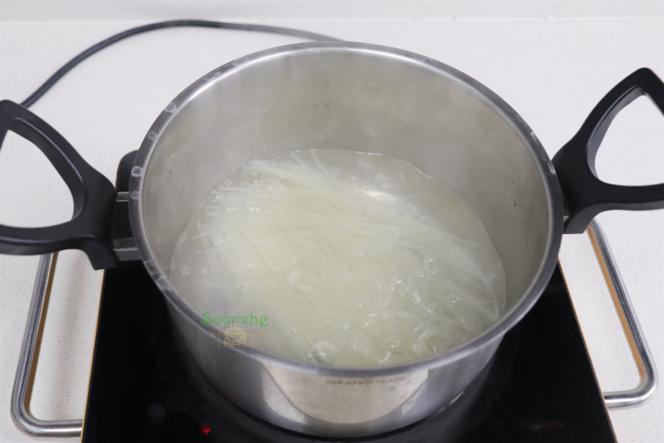 步骤3:锅里倒入适量的水,煮沸之后,放入米粉,水浸没米粉,可以转为中小火,大约10至15分钟,米粉煮熟的时间稍微长些,如果有气泡溢出锅面,可以加冷水继续煮,直到米粉全部煮熟。其中:一边煮,要一边用筷子搅动,不要让米粉成坨。