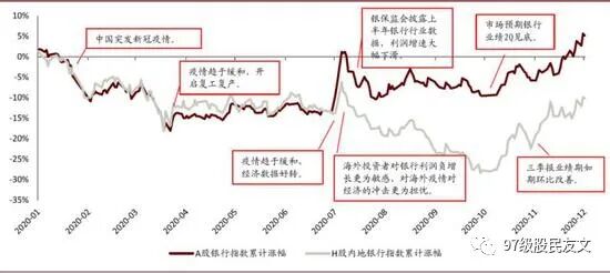 中金在12月3日发布的报告中指出,当时银行处于未来5个季度业绩V型反转的起点,处于风险溢价因素反转的起点,处于估值仓位反转的起点。宏观经济复苏趋势明确,流动性环境亦有利于银行业绩表现,向前看,预计A股和H股银行指数未来3-5个季度的上涨空间分别为50%和60%。
