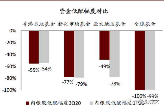 该机构将港股市场上各类基金中规模较大的作为样本,追踪其持仓情况,整体而言3Q末内银股低配幅度较2Q末改善有所改善,其中亚太地区基金低配幅度由2Q末的78%下降为3Q末的49%,新兴市场基金低配幅度由79%下降至77%,香港本地基金和全球基金对内银股的低配幅度环比基本持平。