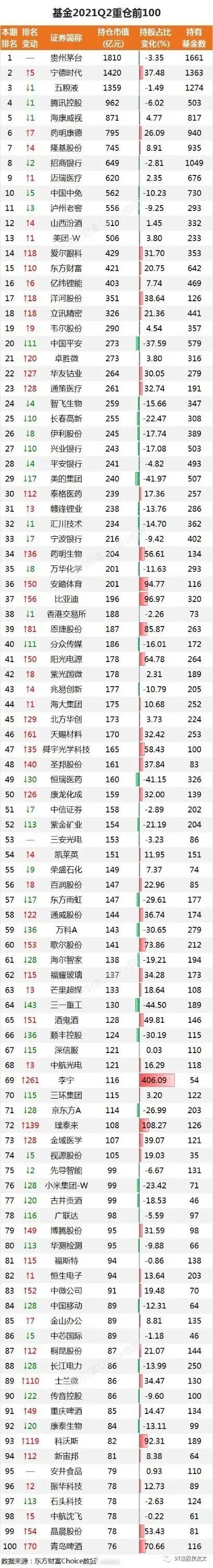 茅台还是位居第一名,宁德时代上升到第二名,基金持股占比增加37.5%,平安下降15名到了第20名,持股下滑了37.8%。