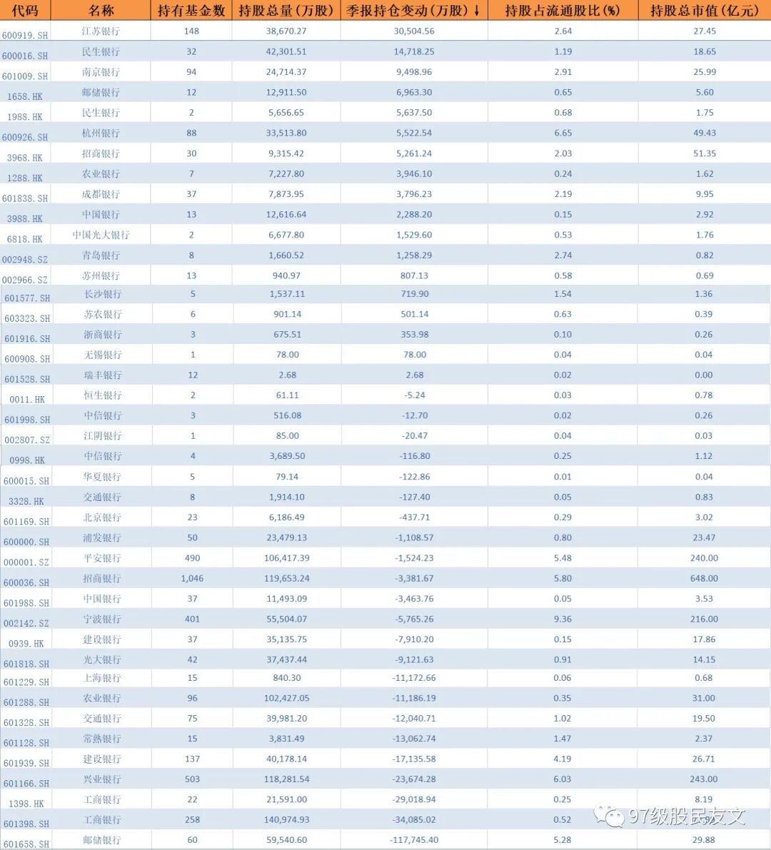共有43只银行股(包括A、H股)出现在公募半年报中,其中11家银行二季度获公募增持超过千万股,分别是江苏银行、民生银行(A、H股)、南京银行、杭州银行、邮储银行(H股)、招商银行(H股)、农业银行(H股)、成都银行、中国银行(H股)、光大银行(H股)、青岛银行。