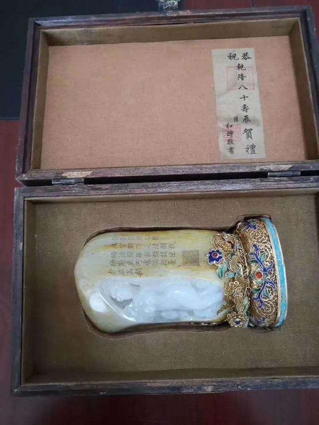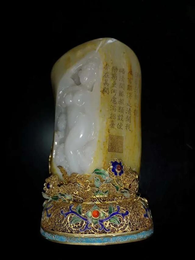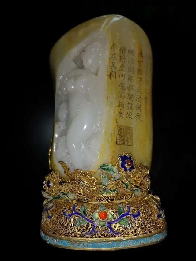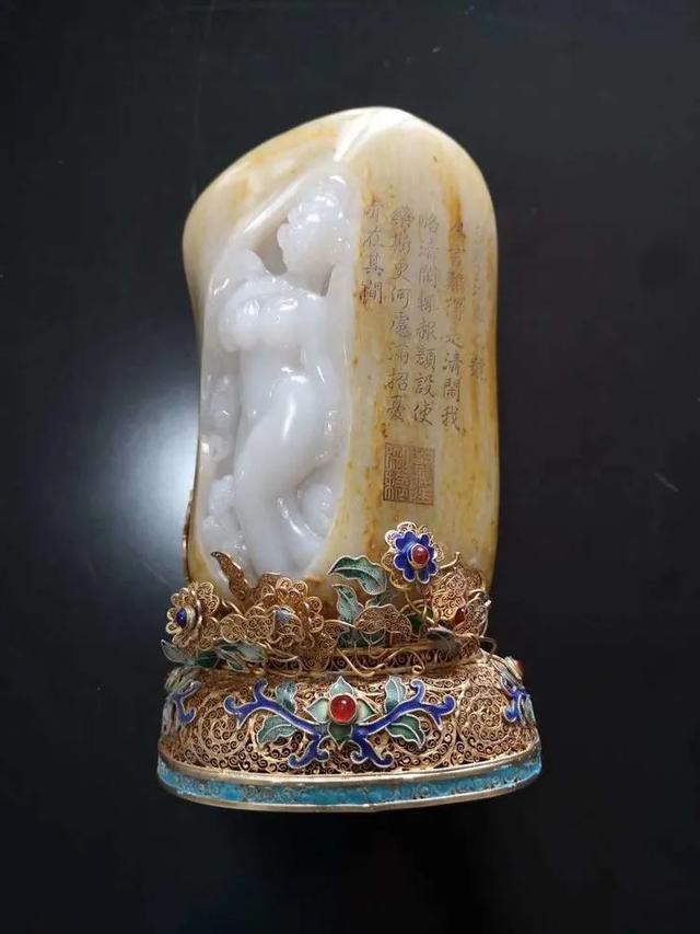 一件稀世珍宝:这是乾隆皇帝80大寿时,和珅送给他的礼物《贵妃出浴》,材质是羊脂玉的,玉上的诗是乾隆作的。