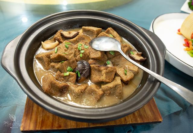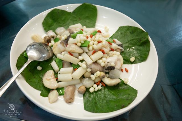 看这道菜的摆盘,是不是极富荷韵。仔细看食材,菱角,鸡头米,藕,菌菇的组合,都是新鲜的时令菜。这道菜让我想起了一句诗:“江南可采莲,莲叶何田田。”