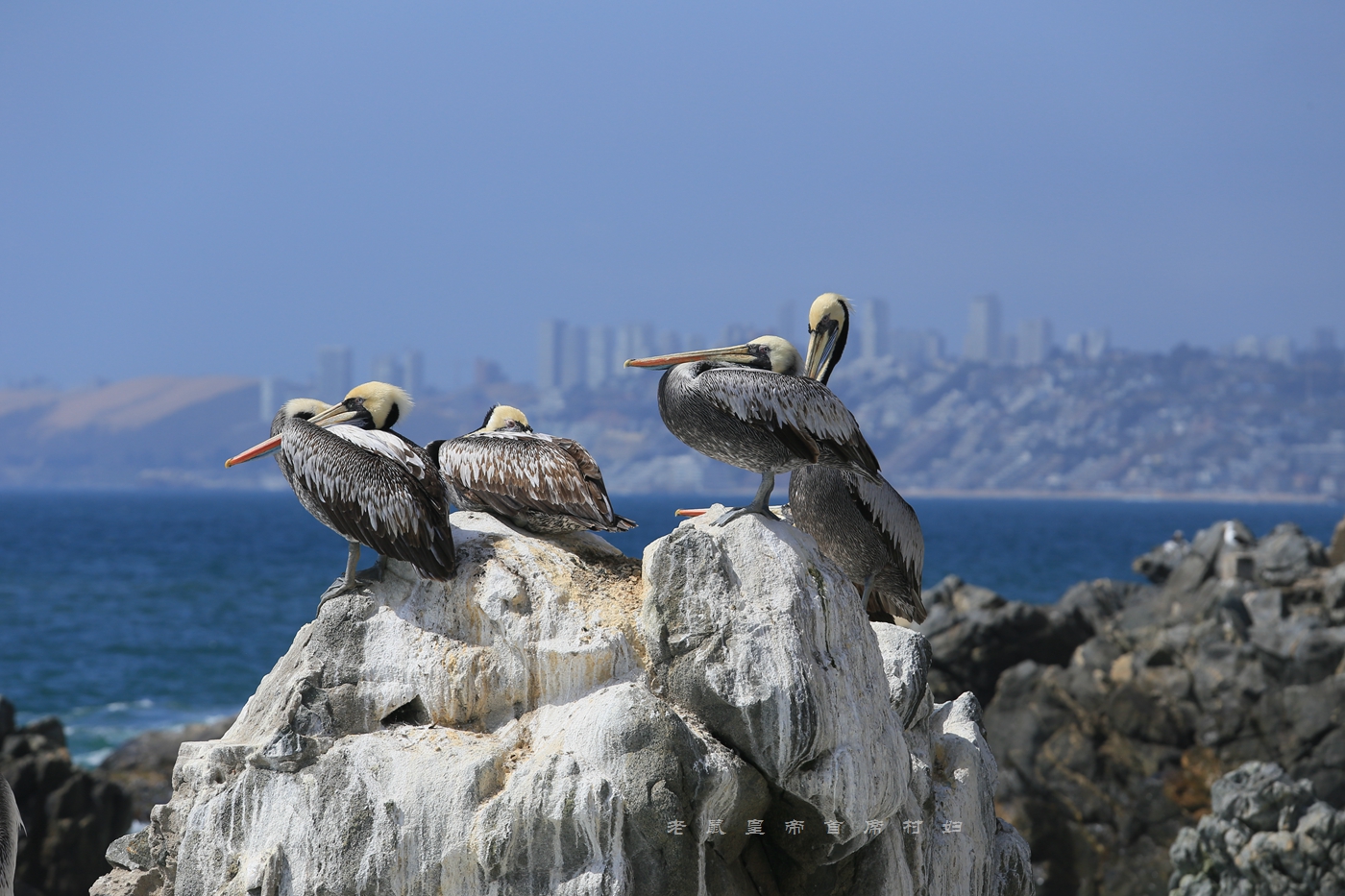 在大海狮旁边的礁石上,是两只羽毛雪白的鸟儿,再远点,又停着一群身材硕大嘴巴长长的大鸟。所有瓦尔布莱索这些生灵都没把距离它们十几米远处端着长枪短炮的人类放在眼里。可见,当地的生态环境是何等的好!人与动物的相处是多么的和谐。