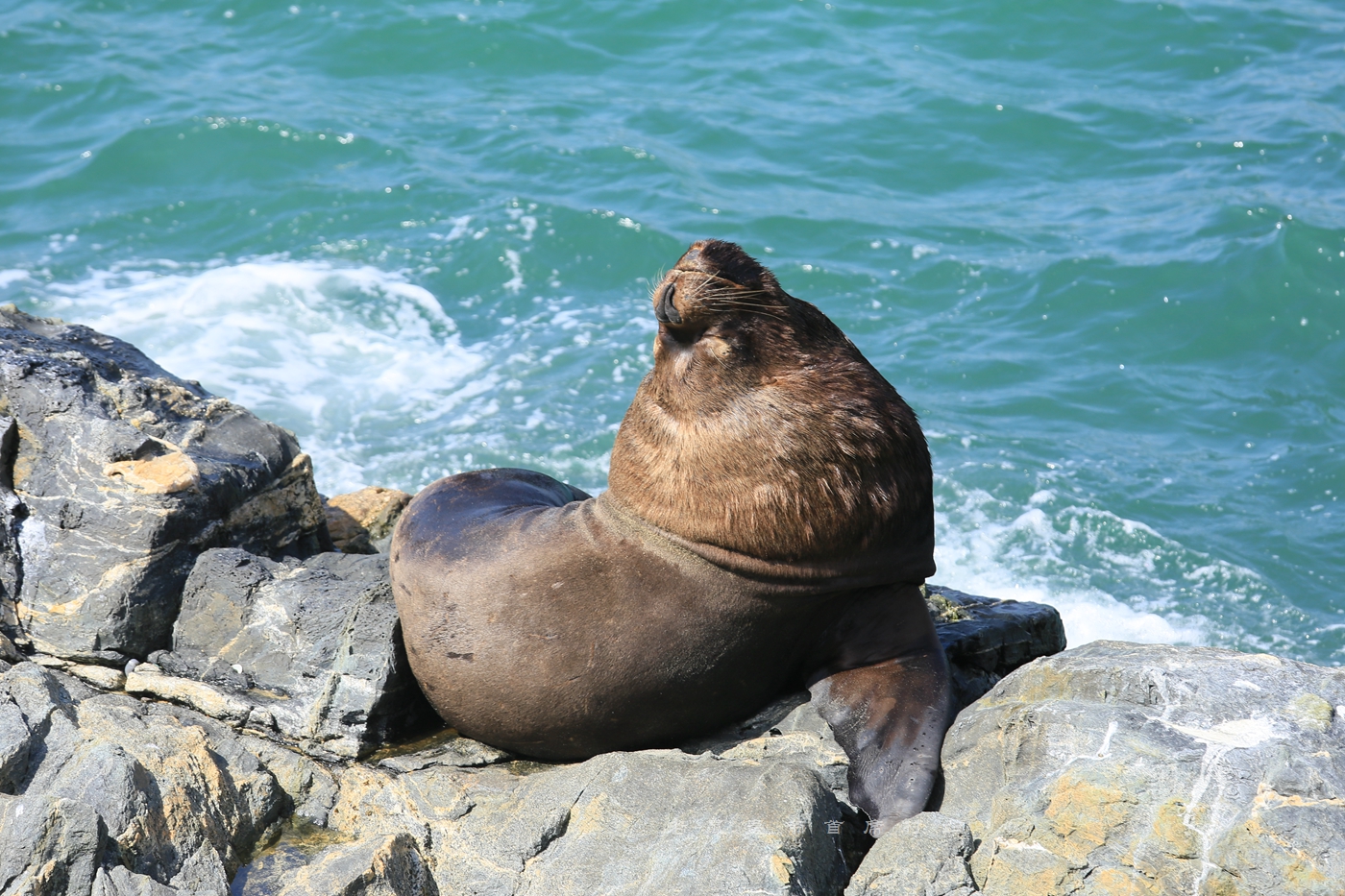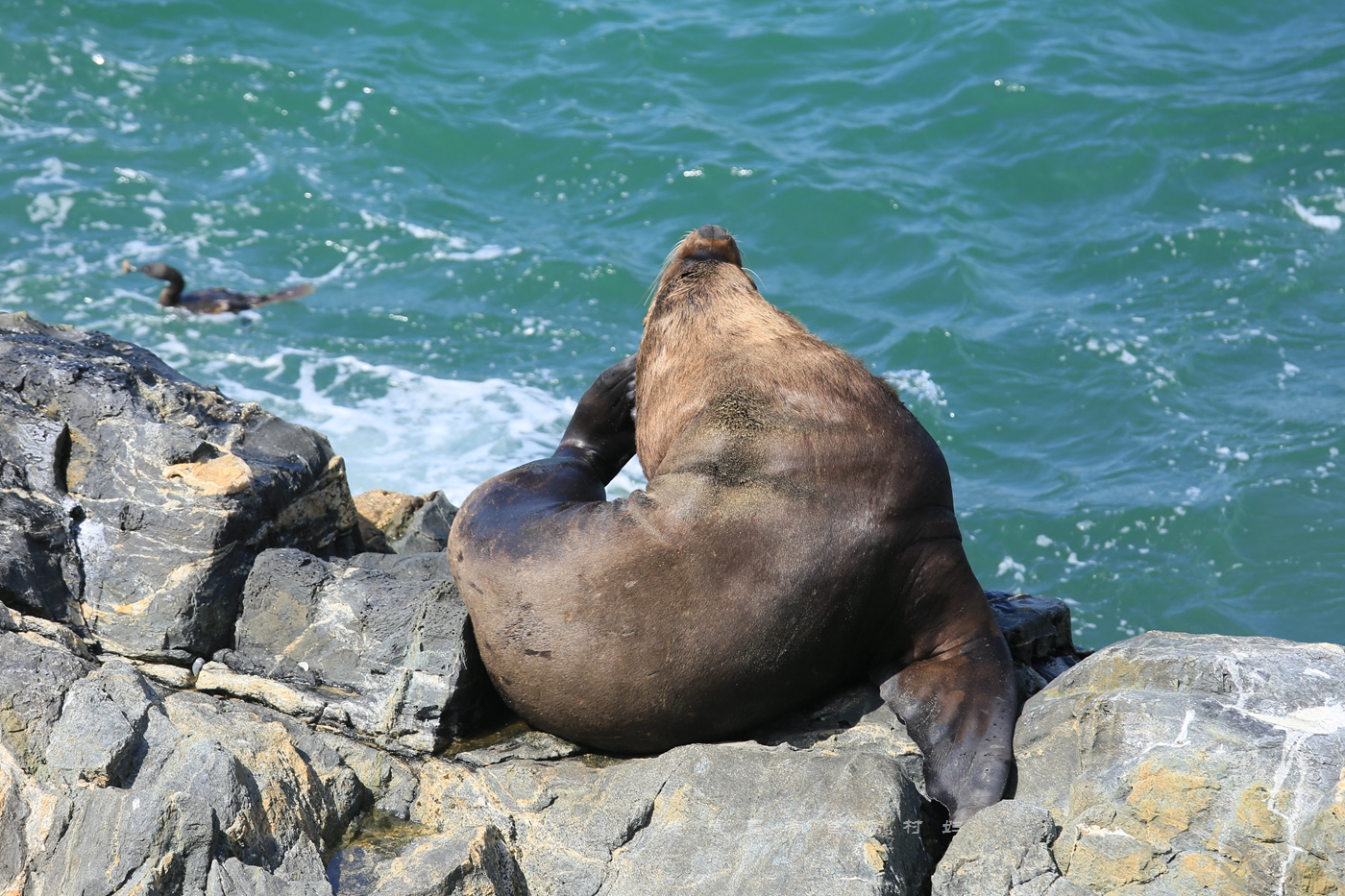 这是我们遇到的第一只大型海洋生物——海狮。它以一种无比舒服的姿势瘫坐在一块礁石上,距离我们不过十米远,旁若无人地一会儿托腮望天、一会儿各种挠痒痒。