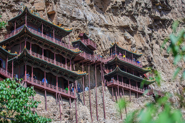 据导游介绍,首先在崖壁上打外小内大的孔,在孔里放一个木楔子,再把加工有楔口的横梁用力砸入,洞里的木楔子便会楔入横梁里,外面越用力,里边咬合的就越紧,寺庙的重量传递到岩壁,以这种半插崖壁的横梁为基础,借助岩石的托扶,与回廊栏杆、上下梁柱紧密链接,从而形成的木质框架式结构,建造成了 “悬空寺”