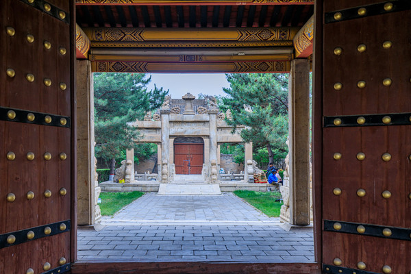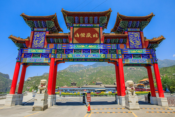 走出金龙口便是恒山山门。恒山山门高10米,宽16米,明清风格,为四柱七楼,三开门格式,混凝土浇注,纯白大理石围基,斗拱铺作,黄琉璃瓦覆顶,正面正中匾额“北岳恒山”为原新华社长、当代大手笔穆青题写,后面匾额“绝塞胜境”系当代书法名家夏桐郁所书,整个山门庄严雄浑。