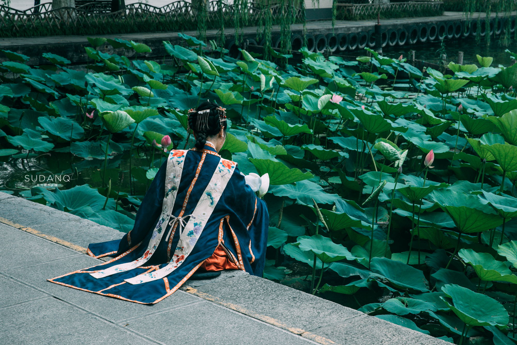 当地女孩身穿汉服,手持白荷,坐于湖畔,仿佛是回到了多年前,乾隆遇见了夏雨荷。