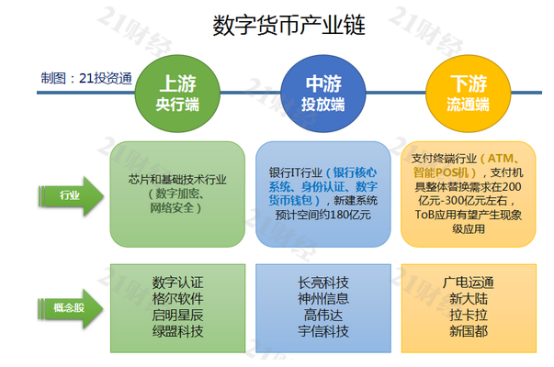 从投资机遇方面来看,数字货币全面落地,产业链各个环节均有利好。各大券商普遍认为,银行IT 、支付落地场景有望成为核心受益产业链。中长期来看,银行内有望形成一个以数字货币为基础的新的核心系统,这将给整个银行IT行业带来更大的增量。此外,便捷匿名的“双离线支付”带来线下支付终端的大量升级改造需求。包括上游的安全加密和KYC认证(实名认证机制)等企业、中游的银行IT架构改造和支付企业、下游的POS机和ATM机等终端以及与硬件钱包建设和手机APP钱包设计相关企业都将迎来机遇。