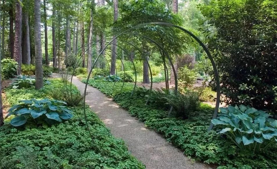 地面的铺装通常是软性的,木甲板很常见,花境较多的区域会铺上厚厚一层松软的细块树皮。