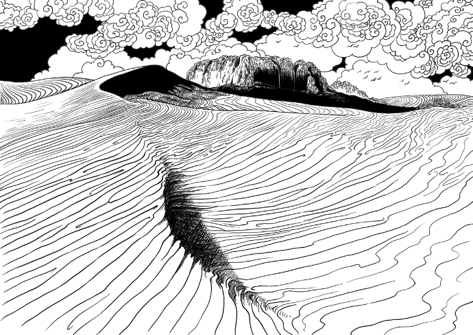 一面坡上,一个影子依稀可辨。一头牛,一架犁,一个人,在山影间起伏。远远望去,就像一面在海上涌动的船帆。那是哥。他在伺候月婆子一样伺候他的土地。