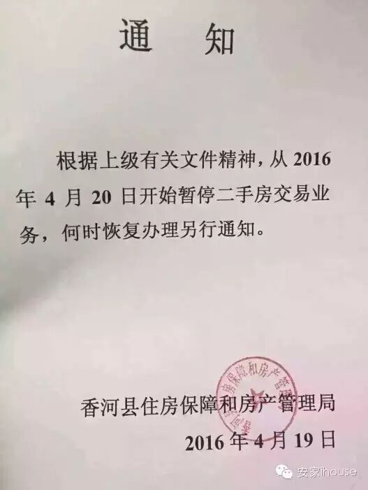 然而,刚刚说完让查看二手房源没几天,4月19日晚,《安家》记者第一时间从本地开发商手里收到一张通知,香河县住房保障和房产管理局2016年4月19日发布最新通知:根据上级有关文件精神,从2016年4月20日开始暂停二手房交易业务,何时恢复办理另行通知。《安家》记者登录香河县住房保障和房产管理局官方网站,更新内容显示最新是2016年1月8日,未有对新政的更新。