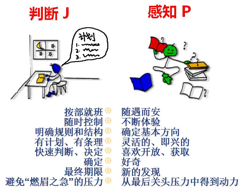 J 判断(Judgment):喜欢做计划和决定,愿意进行管理和控制,希望生活井然有序。例如:重视结果,重点在于完成任务、按部就班、有条理、尊重时间期限、喜欢做决定、说话斩钉截铁。