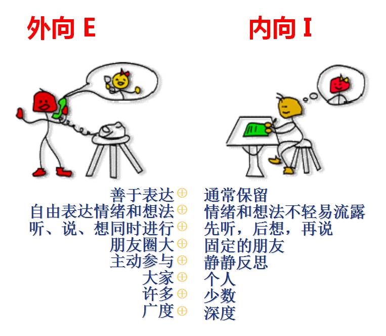 E外向(Extraversion):关注自己如何影响外部环境;将心理能量和注意力聚集于外部世界和与他人的交往上。例如:聚会、讨论、聊天。