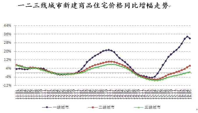 5月份一二三线城市新建商品住宅价格指数同比增幅分别为32.1%、6.6%和0.8%。 二三线城市的同比增幅在5月份继续扩大,未来几个月还将继续扩大,但估计将于四季度明年一季度,也会见顶。