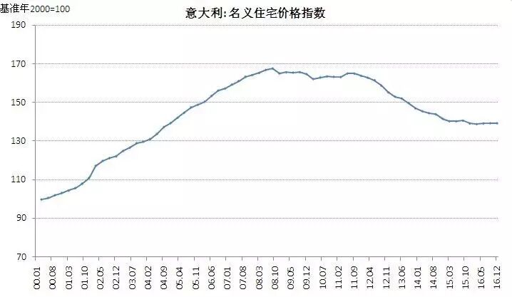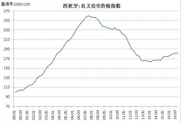 最后,看西班牙。01年至07年,西班牙房价涨幅巨大,肯定出现了泡沫。07年下半年房价见顶小跌,其后持续下跌,其中欧债危机爆发后,加速下跌。直至2013年企稳,2015年以来房价开始小幅反弹。