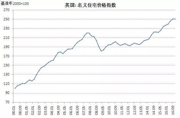 这里只讲下英国吧。根据下图的英国房价走势。英国房价下跌的时点,明显晚于美国,08年才下跌,而且只跌了一年左右,便筑底。