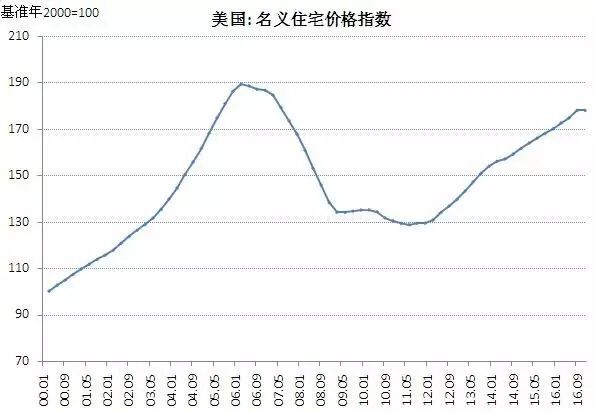 2012年开始,美国房价进入上升通道,2017年以来已经创新高(图中数据截至2016年9月)。
