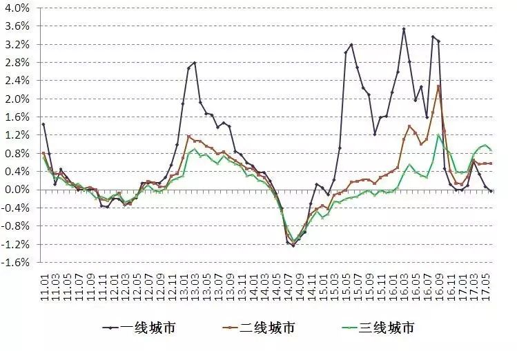 下图是一二三线城市的新建商品住宅的房价环比变化。