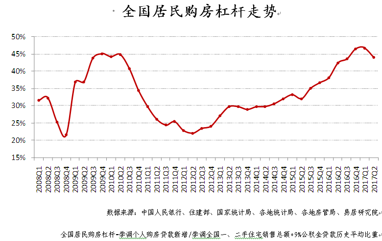 数据显示,全国居民表内购房杠杆率从2015年三季度开始快速上升,2016年4季度刷新历史最高值,达到46.4%,2017年1季度,该指标小幅上升至46.8%,2季度回落至43.9%。目前来看,基本可以确认当前全国个人购房杠杆已经步入下行通道。