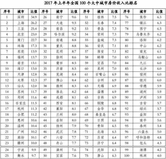 2017年上半年,深圳房价收入比小幅回落至34.9,但依旧位于百城榜首,比第二名上海高出近三成,值得注意的是,深圳全口径下的居民人均可支配收入包括了部分郊区农民和城中村居民,使得城市收入水平相对偏低,因此比值存在高估可能。上海、三亚、北京、厦门等4城房价收入比也相对较高,均超过22。此外,超3成城市房价收入比低于我们界定的全国合理区间的低限,即6.5,其中呼和浩特、包头、湘潭、株洲等4城低于5.0,位于百城末尾。