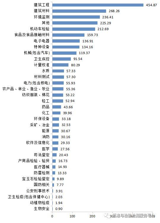 营收在100亿元以上的检验检测领域为:建筑工程(454.87亿元)、建筑材料(268.26亿元)、环境监测(236.41亿元)、其他(225.29亿元)、机动车检验(212.69亿元)、食品及食品接触材料(159.73亿元)、电子电器(136.91亿元)、特种设备(134.16亿元)、机械(包含汽车)(119.37亿元)。