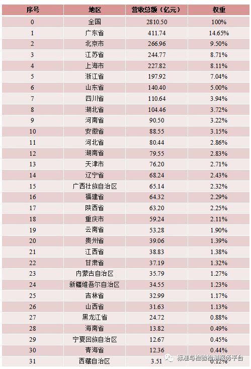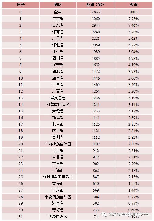 检验检测机构数量排在前十位的省依次为广东(3060家)、山东(2944家)、河南(2248家)、江苏(2221家)、河北(2059家)、浙江(1989家)、四川(1885家)、辽宁(1652家)、湖北(1472家)和湖南(1446家)。以上10个省的检验检测机构数量占全国总量的53.14%。