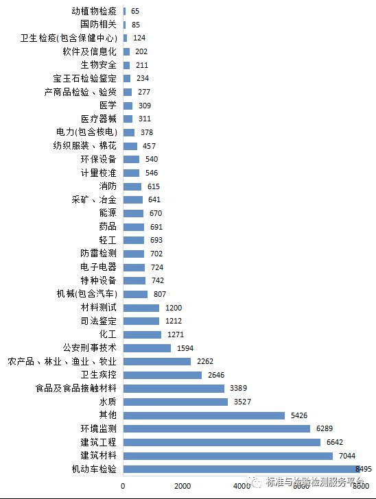 从检验检测专业领域来看,2018年,机构数量排在前列的检验检测领域为:机动车检验(8495家)、建筑材料(7044家)、建筑工程(6642家)、环境监测(6289家)、其他(5426家)、水质(3527家)、食品及食品接触材料(3389家)、卫生疾控(2646家)、农林渔牧业(2262家)。