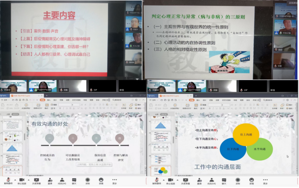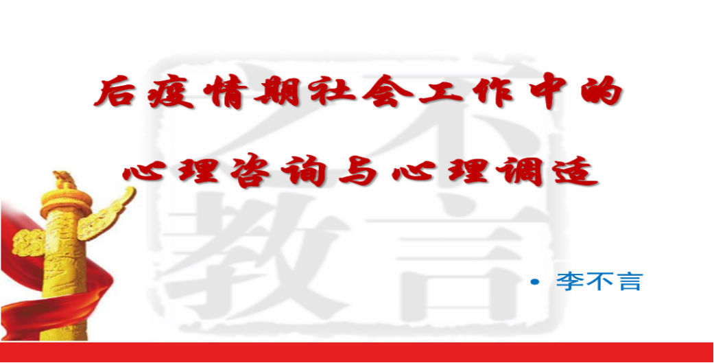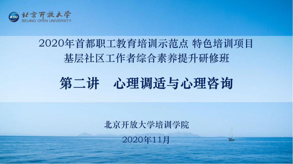 基层社区工作者综合素养提升研修班由北京开放大学主办,北京不言之教教育咨询有限公司承办。培训以“提升基层社区工作者综合素养”为主题,面向首都基层社区工作人员。因疫情期间全部采取线上直播课和线上录播课程回放相结合的方式,其中线上直播课程《后疫情期社会工作中的心理调适与心理咨询》、《社区工作人员沟通能力与技巧》、《现代办公能力技能提升》3场次共6课时,录播课程《基础心理学》、《心理沙盘整合技术》、《心理危机干预实用技术》、《沟通的艺术》、《如何成为一名优秀的心理咨询师》等38场次共42课时。60多名首都社区工作者参加了培训。