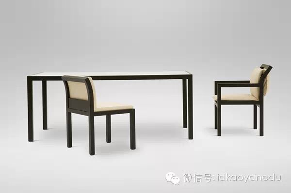 这个桌子的桌梁部件与桌腿部件的粗细一样,像一条线那样穿越空间,椅子所有部位的粗细也一样。为使框架数学化,让桌子看不到特别的意义,桌面采用玻璃。采用组合装配式设计。