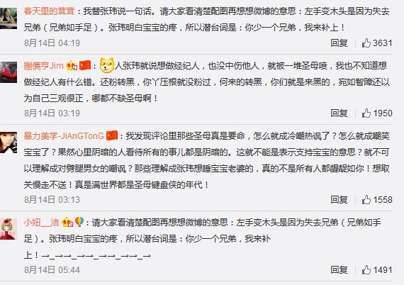 我替张玮说一句话。请大家看清楚配图再想想微博的意思:左手变木头是因为失去兄弟(兄弟如手足)。张玮明白宝宝的疼,所以潜台词是:你少一个兄弟,我来补上!