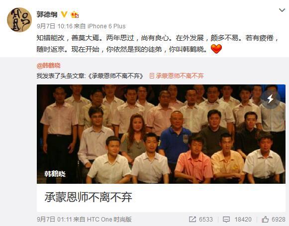 随后,郭德纲转发该微博,并写道:“知错能改,善莫大焉。两年思过,尚有良心。在外发展,颇多不易。若有疲倦,随时返京。现在开始,你依然是我的徒弟,你叫韩鹤晓。”