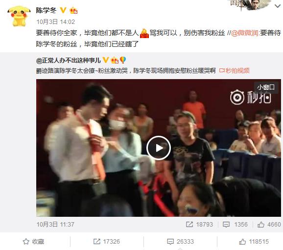 微博号微微润用粗鲁文字激怒陈学冬,一向温柔的陈学冬气得怒怼网友展开撕逼。微微润转发评论陈学冬:“要善待陈学冬粉丝,毕竟他们都瞎了”。这还了得,敢骂陈学冬的粉丝,随即,陈学冬转发网友微微润的评论,并喊话该网友:要善待你全家,毕竟他们都不是人。