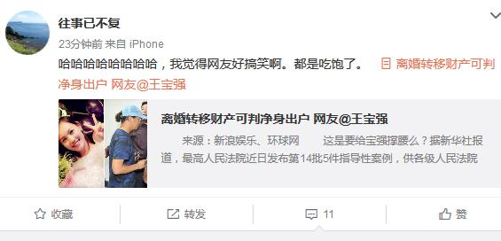 最近,关心王宝强的网友们总算松了口气。因为,最高法院出了新的离婚案的财产分割法。网友们赶紧去宝强微博下面报喜:“宝宝快搜最高法!你的天道来了!”“最高法颁布指导案例:离婚转移财产可判净身出户!”
